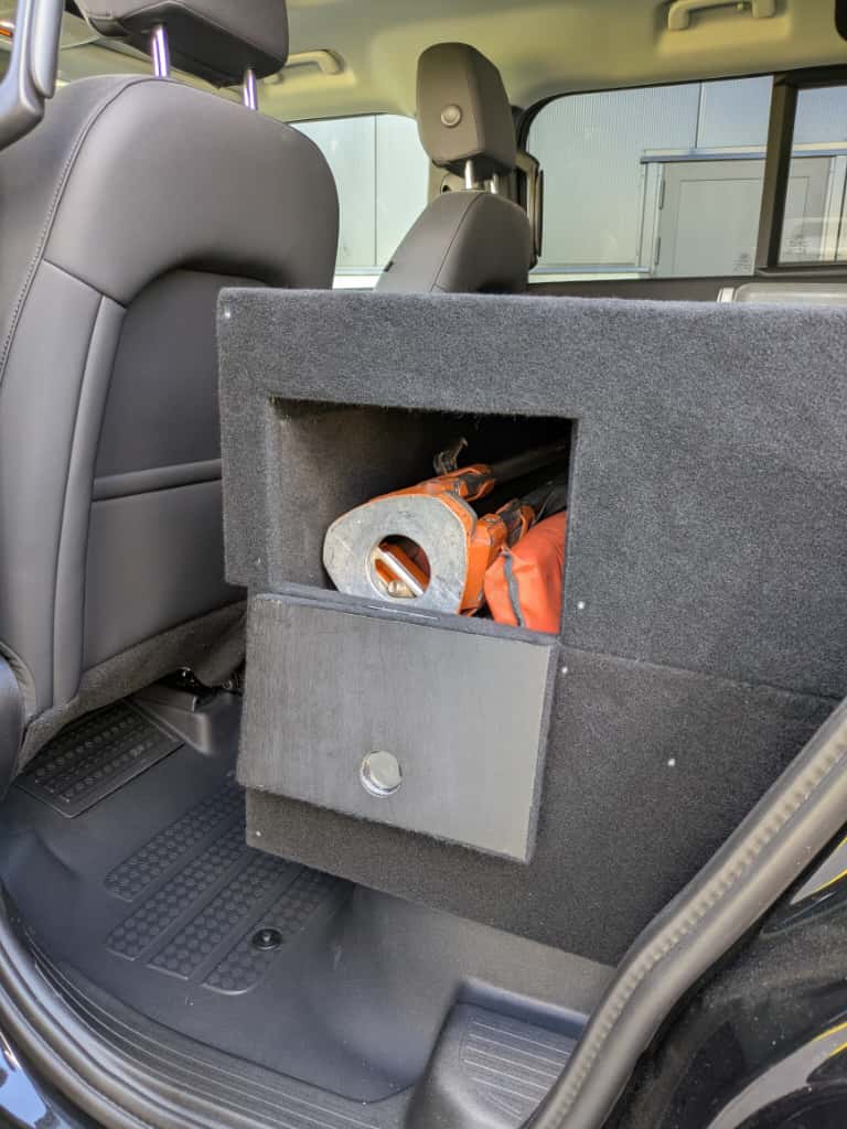 Deze Defender werd op maat ingericht volgens de noden en wensen van de klant. De wagen werd voorzien van een dubbele laadvloer met 2 lades geïntegreerd van GEMA. Daarnaast werden nog opbergluiken toegevoegd om bepaalde materialen veilig te kunnen opbergen.
