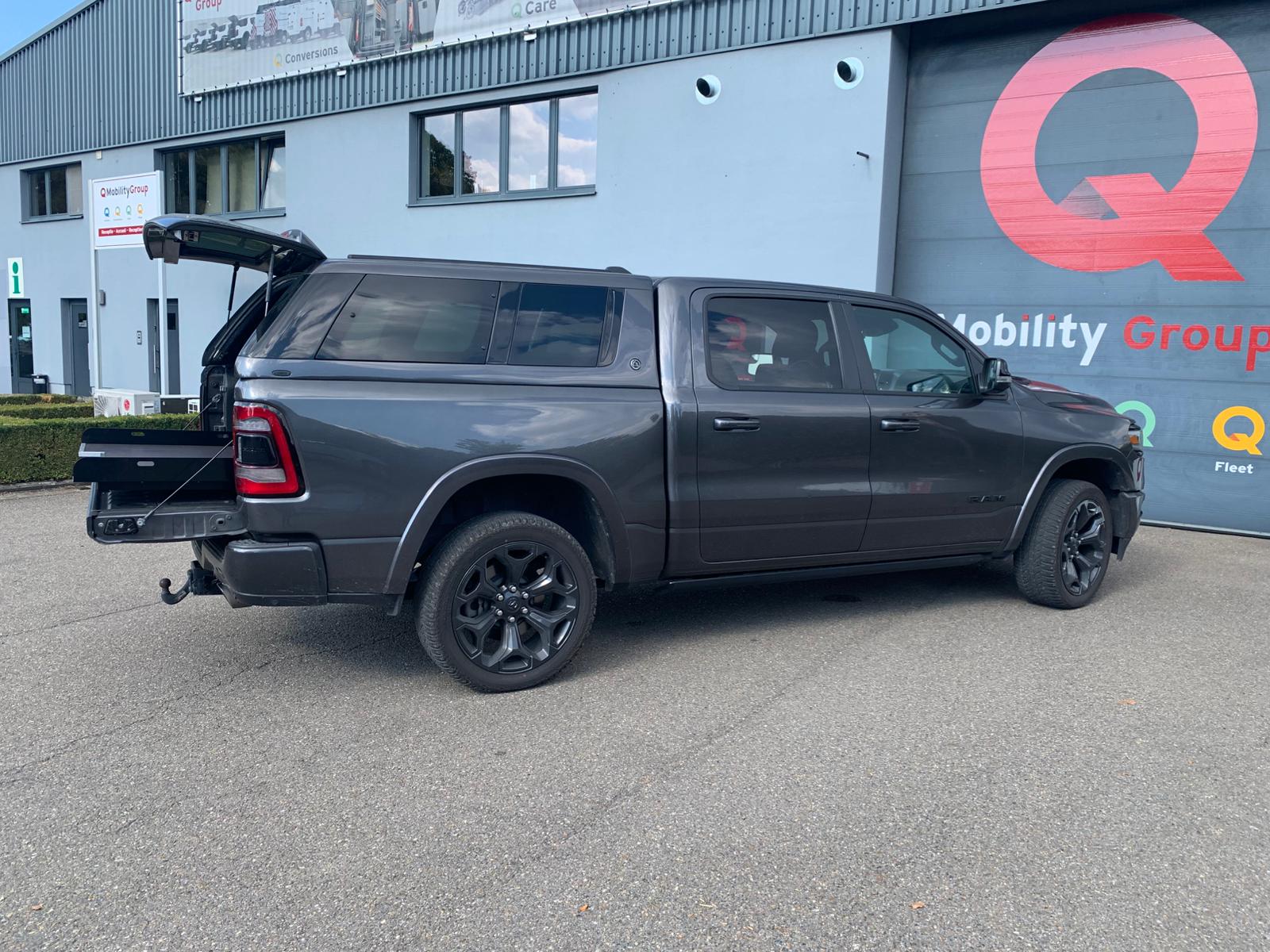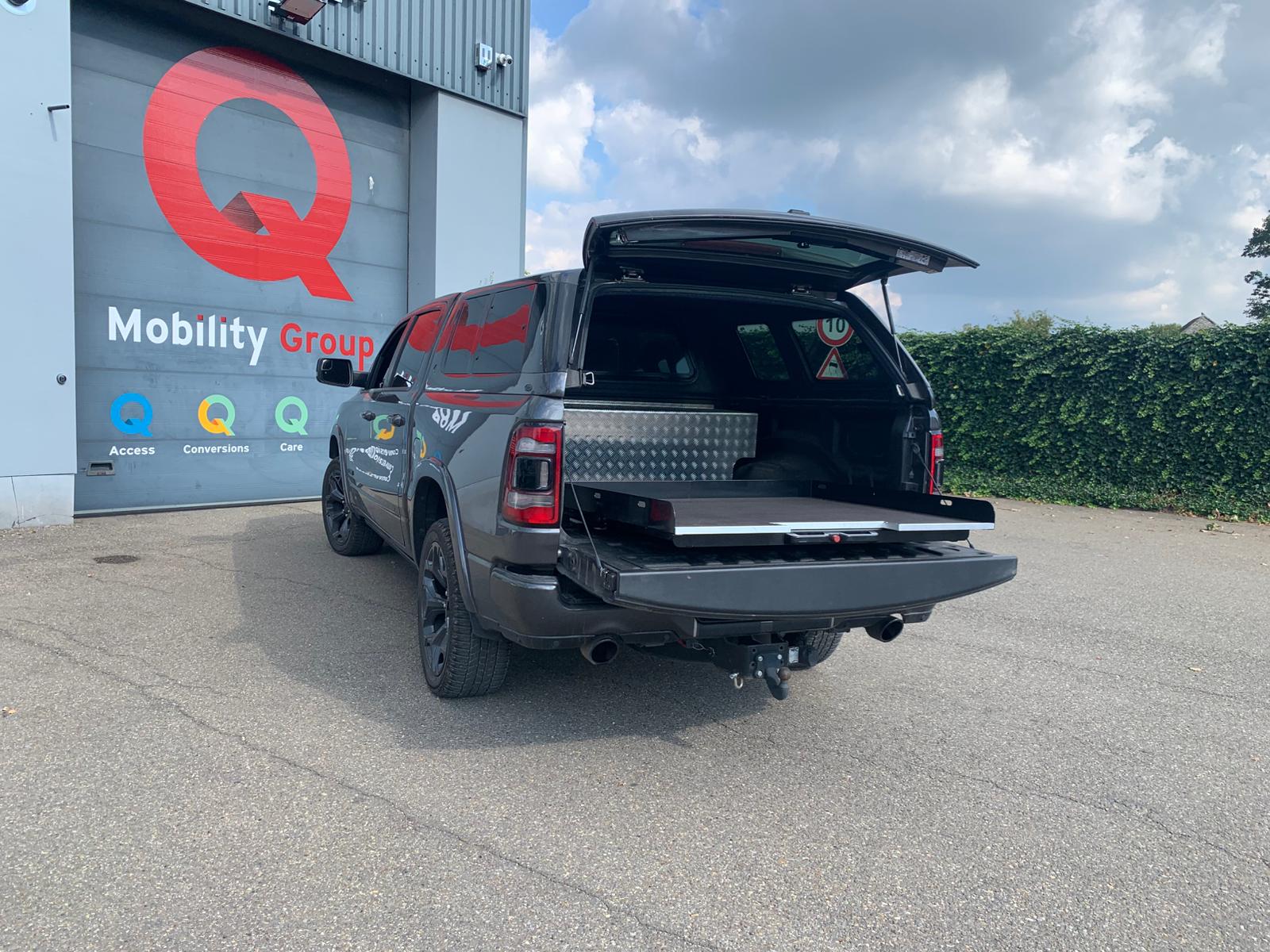 Deze Dodge Ram werd uitgerust met uitschuifbare lade of bedslide genoemd. Is een eigen ontwikkeld product onder Q-Acces en heeft het uniek kenmerk dat wanneer de bedslide volledig is uitgeschoven is, hij nog steeds een draagkracht heeft van 250kg. Verder beschikt hij nog over een anti slip laag in composiet. We hebben deze bedslide beschikbaar voor diverse types Pick-Up.